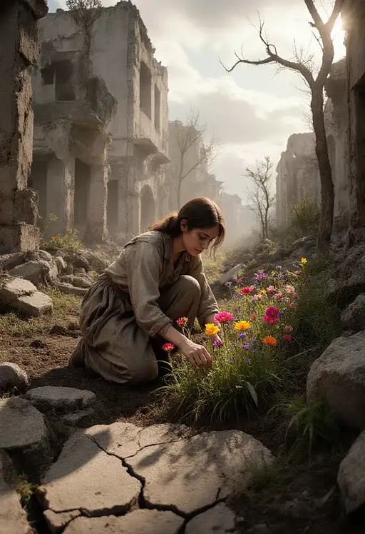 The gardener, dressed in tattered clothing, stands amidst the crumbling remains of a once-great city. The air is heavy with the aroma of earth and decay. She kneels, her hands immersed in the soil, tending to vibrant flowers that defy the desolation around them. A patch of vibrant greens and vibrant colors bursts through the cracked concrete, as if nature is reclaiming its rightful place. Sunlight filters through the clouds, highlighting the resilience and beauty of life. Wildflowers, grasses, and ancient trees stand tall, their branches swaying gently in the breeze, a silent invitation for nature's resurgence.