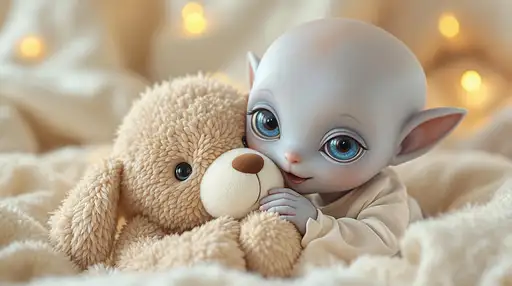 7 months ago a beautiful and cute alien babie, with bright blue eyes, wearing adorable pyjamas, hugging and playing with a plush animal, the plush animal is much larger than the babie, set against a soft, cream and white tone background that adds warmth and coziness to the scene, the atmosphere is very charming, and full of happiness, uhd photorealistic quality 91e1b4b2a90 PRO 1 31