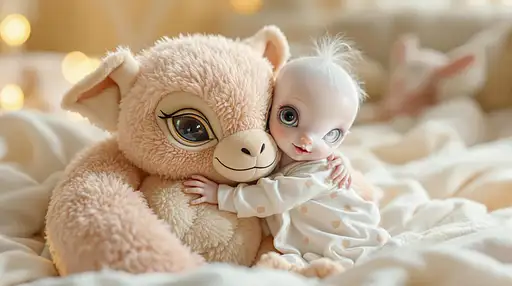 7 months ago a beautiful and cute alien babie with topaz color eyes, wearing a silk white adorable pyjamas, hugging and playing with a plush animal, the plush animal is much larger than the babie, set against a soft, cream and white tone background that adds warmth and coziness to the scene, the atmosphere is very charming, and full of love and happiness, uhd beautiful details and textures, perfect image characters photorealistic quality 91e1b4b2a90 PRO 2 55