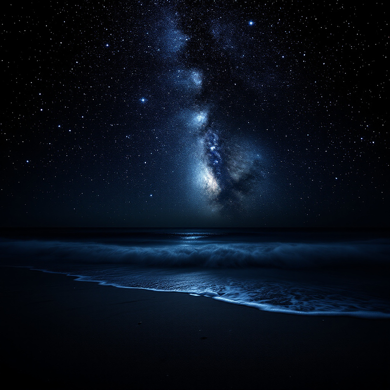 9 months ago The starry sky shines on the beach, with dark gray sand and shallow water in front of it. The Milky Way is visible above the sea level, creating an endless expanse under the night view. It's like being alone at home, with the vast ocean adding mystery to the scene. A black background highlights details, and high contrast makes everything more vivid., Photorealistic, --ar 59:128 Slinkychips PRO 1 52