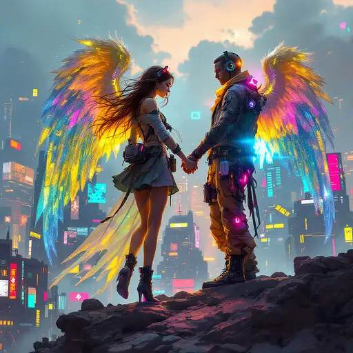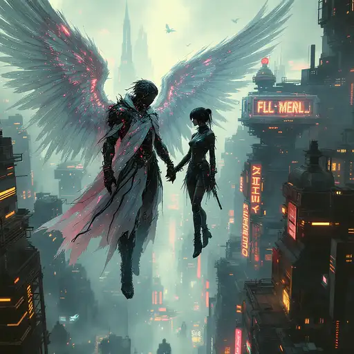 8 months ago Cyber punk angel holding hands with a human dressed in cyberpunk clothes above a cyber punk city ec3412fd4ff 0 20