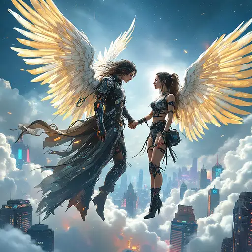 8 months ago Beautiful cyber punk angel holding hands with a human girl dressed in cyberpunk clothes above a cyber punk city ec3412fd4ff 0 31