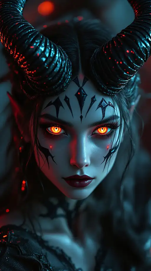 7 months ago An anime-style demon girl stands in the foreground, captured in an intense, **third-person low-angle perspective**, exuding a powerful and seductive presence. Her **twisted, sharp demon horns** curve menacingly from her head, contrasting beautifully with her long, flowing hair that shimmers in the ambient lighting. Her glowing, **piercing eyes** radiate an eerie, supernatural intensity as embers flicker around her. Pulsar212121 5 210