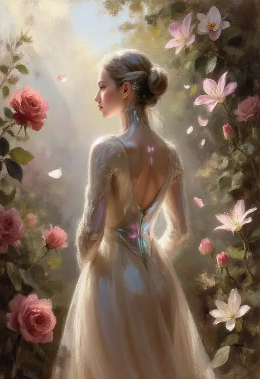 (Primary Subject: Emotionally Expressive Android Woman with Dual-Layered Skin, Painted in Impressionist Classical Renaissance Style, 1.7 weight) — in the heart of a lush, sun-drenched garden overflowing with blossoms, an android woman stands quietly, her form captured in the painterly elegance of a Renaissance-era oil painting. Her body is sculpted and graceful, rendered with soft impressionist brushstrokes that blend into surreal detail—her figure radiant, yet ethereal, like a machine-angel frozen in time. Her “skin” is composed of two delicate, interwoven layers: The outer layer is smooth, reflective, and subtly fluid, shimmering with hints of pale pink, soft violet, and dusky gold, like liquid mercury caught in a sunset. It has the appearance of gently flowing molten glass, and catches the dappled garden light with painterly elegance. Beneath it, faintly visible through the translucent surface, lies a subdermal lattice—a softly glowing core of golden circuitry, like sacred geometry woven into synthetic muscle. It pulses faintly, like a slow heartbeat of light, giving her form an inner radiance, a soul made of signal (subtle luminous inner structure beneath transparent surface, 1.6 weight). She wears no armor, no exposed wires—only that liquid-smooth surface, glowing softly in the sun. A thin, continuous line of amber-orange light traces up the outside of her legs, over her hips, across her shoulders and arms, like a haloed signature etched into her form. Her visor-like faceplate—a curved golden-glass surface—reflects the garden’s warm light. Though faceless, her entire body language conveys profound emotion: one hand lightly touching her chest, the other extended gently toward a single open flower, as if remembering something. Her posture is soft, tender, almost melancholic—like a saint carved from future metal, lost in sacred thought. The garden blooms around her in classical beauty—roses, lilies, orchids, and surreal blossoms from impossible species. Sunlight pours through foliage in golden beams, casting her figure in a divine backlight. Petals drift in the air like thoughts. Her reflection shimmers faintly in a nearby pool. Rendered in the style of a classical oil painting—with visible brush textures, soft baroque lighting, volumetric haze, and subtle chiaroscuro across her form. The colors are rich and warm—sunset gold, floral crimson, blush pink, and soft lavender—interplaying with reflections in her skin like a moving canvas.