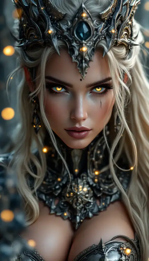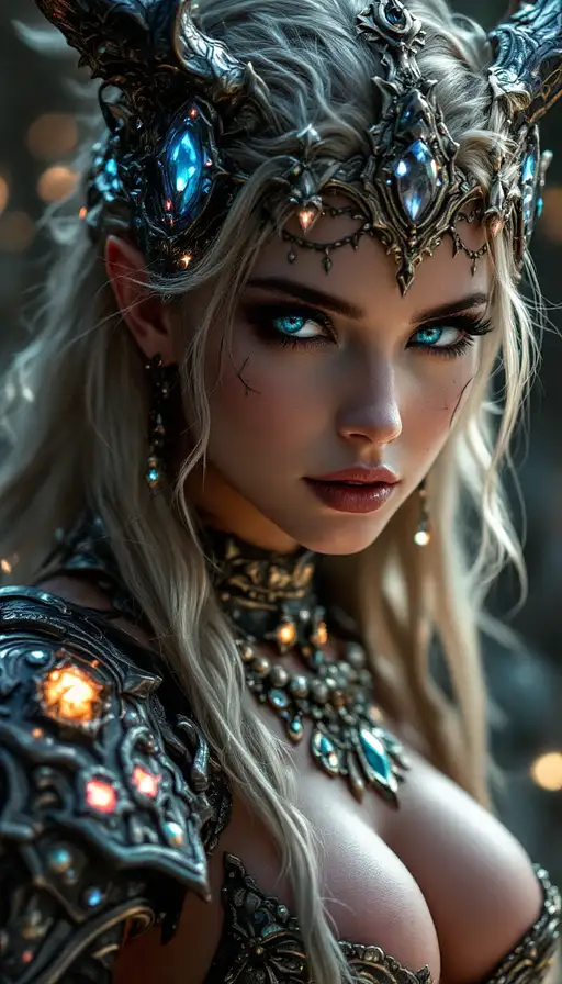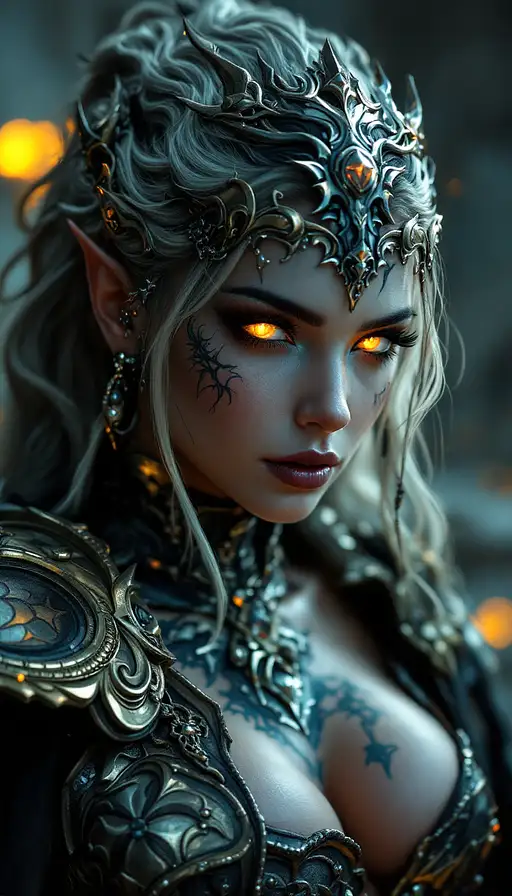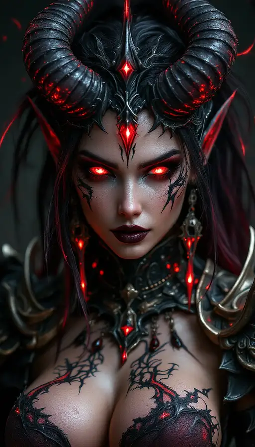 5 months ago Only face view, glowing eyes and tattoos, Perfect sexy succubus, demon, hell, fantasy game, round silicon breasts, mascara makeup, sexy face, in extrem sexy epic fantasy armor withe many accessories and detailles. Many glowing things, fantasy, 4k, ultra quality, epic, sexy fantasy, mmorpg, mystic 812c6bbb11a PRO 0 19