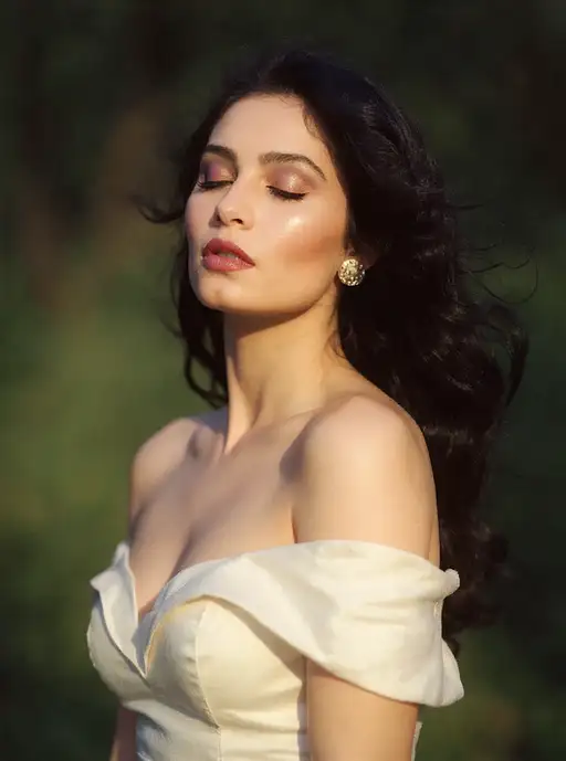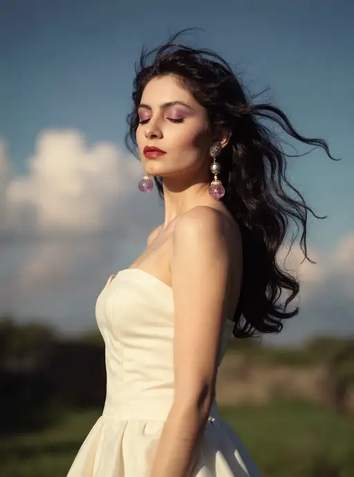 4 months ago A half Body Photo of a beautiful dark haired girl, feeling the wind and sun on her face, her eyes are closed, hair blowing lightly in the wind, natural skin complexion, slim with curves, white silk gown, outdoor background, dramatic, cinematic soft lighting, captured by {randomly selected} photographer. This image looks glamorous and elegant in style and outdoor background that was recognized as a contest winner. It has been featured on CG Society. Cinematic SlickRick56 PRO 0 35