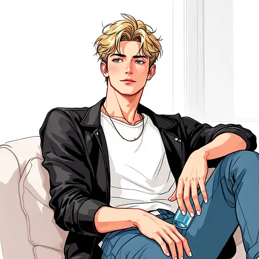 french man, sitting, water bottle, relaxed, calm, blushing slightly, slender but muscular, toned body, defined physique, feminine hands and feet, nude manicure, french face, slightly feminine but masculine features, short haircut, natural blonde hair, blue eyes, black leather jacket, white t-shirt, blue jeans, white sneakers, short socks, manhwa style, clean lines, vibrant colors, detailed shading, expressive eyes