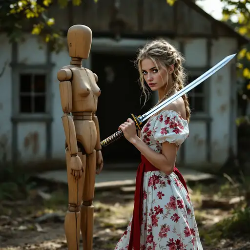 5 months ago full body view of A very beautiful minute blonde woman with braids, flowery dress, barefoot (((show the foot))) hold a katana, held in high guard against a wooden training dummy, placed in the farmyard in front of the farmhouse. wildcat2 PRO 0 39