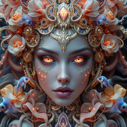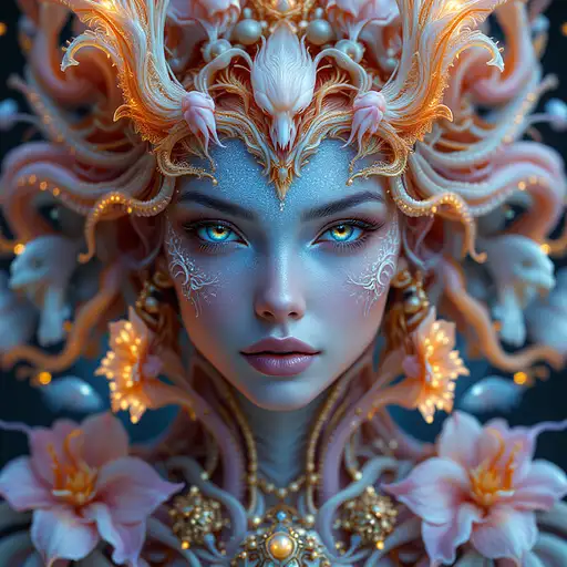 9 months ago Goddess close-up portrait ribcagel. jellyfish phoenix head, nautilus, orchid, skull, betta fish, bioluminiscent creatures, intricate artwork . octane render, trending on artstation,t symmetrical artwork. cinematic, hyper realism, high detail, octane render, 8k 7804ffe49bc 0 36