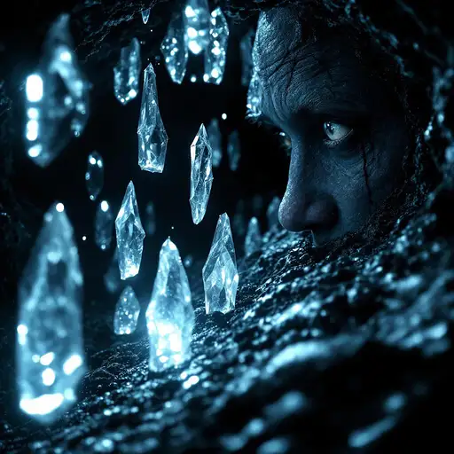 4 months ago photographic, ultrarealistic, ubsurdres, close up of a pitch black cavern, filled with sparkling crystals in mid air reflecting the single gleam of a distant light , and the reflected face of the Gollum in the facets , who is staring at the crystals in awe, off camera , the cave is extremely black with only that one light source mudshark PRO 0 22