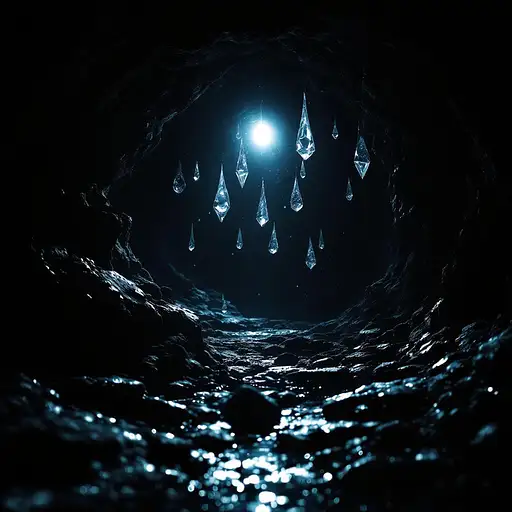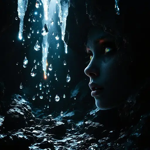 4 months ago photographic, ultrarealistic, ubsurdres, close up of a pitch black cavern, with crystals like teardrops in mid air reflecting the single gleam of a distant light , and the reflected face of the Gollum in the facets , who is staring at the crystals in awe, off camera , the cave is extremely black with only that one light source mudshark PRO 0 22