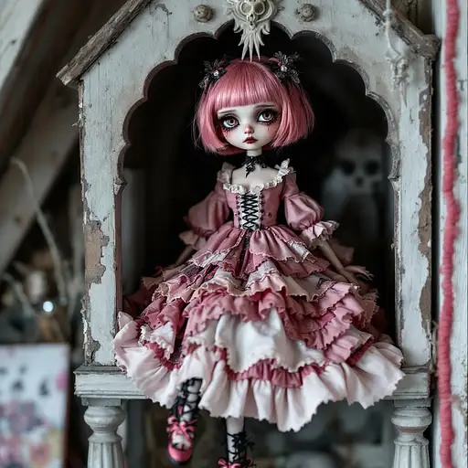 Create an ultra-detailed, photorealistic, high-angle selfie-style portrait of a beautiful young Asian woman in an elaborate white and red gothic lolita or steampunk-inspired cosplay. Subject & Appearance: Face: She has a flawless, pale complexion and is looking directly up into the camera with large, captivating, luminous violet eyes. Her lips are soft and have a natural glossy sheen. Hair: Her hair is long, straight, and jet-black, styled with perfectly straight-cut, thick Hime bangs that frame her face. Elaborate Costume & Accessories: Corset: She wears a tight-fitting, white boned corset made from intricate lace or brocade fabric. The sweetheart neckline is trimmed with delicate white pearls. The front of the corset is fastened with ornate, decorative silver clasps inset with sparkling jewels. Harness: Over the corset, she wears a complex white leather (or faux leather) body harness. It features multiple straps with silver buckles that wrap around her torso and neck, drawing attention to her décolletage. A single, perfect, deep red rose is pinned to the center of the harness. Skirt: The corset is attached to a layered, ruffled white satin skirt. Another deep red rose is tucked into the hip. Headpiece: On her head is a stunningly detailed fascinator. It includes a white birdcage veil, a large cream-colored bow or fabric element, strings of white pearls, a large deep red silk rose, and delicate, dangling red beaded strands that catch the light. Jewelry: A delicate chain of small red beads is draped from the harness over her shoulder. Setting & Pose: The woman is seated on an ornate, antique Victorian-style sofa. The sofa is made of dark, carved wood and is upholstered in a rich, dark floral tapestry fabric with intricate patterns. The setting is a dimly lit, atmospheric room with warm wooden floors and vintage decor, suggesting a steampunk or classical aesthetic. The high-angle, selfie perspective creates an intimate and engaging composition. Lighting & Mood: The scene is illuminated by warm, soft, ambient light that beautifully highlights the textures of the lace, leather, and fabrics. The overall mood is enchanting, romantic, and slightly melancholic, blending elements of elegance and fantasy. The image should be incredibly sharp, with rich colors and a cinematic quality, capturing every minute detail of the costume and environment.