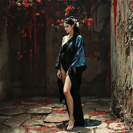 Abstract Full-Body Portrait of a Prostitute – Salvador Dalí (Late-Life Style, Singular Focus & Pure Surrealism) (Surrealism:1.7, Salvador Dalí late-life style:2.0, Dreamlike distortion:1.6, Hyperreal textures:1.5, Chiaroscuro contrast:1.4, Oil-painting brushstrokes:1.5, Organic fluidity:1.6, Metaphysical realism:1.4) A full-body surrealist portrait of a prostitute, painted in the unmistakable late-life style of Salvador Dalí, where dream logic dictates form and reality bends into its own subconscious reflection. She stands alone in the void, a lone figure frozen in motion yet melting into time itself. Her body is elongated but coherent, her limbs refined into one singular, fluid, organic motion, as if she is a sculpture made of half-formed candle wax, melting at the edges but never fully dissolving. Her face remains untouched by distortion, hyperreal and melancholic, eyes darkened with kohl, staring directly outward, unblinking, as if confronting time, fate, and the fabric of reality itself. A single strand of jet-black hair escapes from her carefully pinned curls, swaying in an invisible breeze. Her lips—painted a deep, blood-red—drip slightly at the edges, as if smeared by unseen hands, caught between seduction and sorrow. Her dress, a relic of the past, is a contradiction of luxury and decay, the hem transforming into thin wisps of smoke, curling and dispersing into the canvas. The fabric is stretched unnaturally, its folds elongating like the melted forms of Dalí’s classic clocks, one shoulder slipping in an eternal descent, never quite falling. The setting is an infinite, surreal landscape—a lonely street with no visible end, where shadows stretch longer than their owners, and the cobblestones appear to melt into liquid mercury. In the background, a large, antique pocket watch, twisted and partially submerged in the air, hangs frozen at an uncertain hour, its hands warped into elongated spirals. A single red rose, impossibly large and impossibly alive, hovers just behind her, its petals peeling away like fragments of forgotten love letters. The air feels thick, painted with visible brushstrokes, where light and shadow do not obey the laws of physics—instead, they bleed into one another, wrapping around her body in soft, liquid chiaroscuro, mimicking the curvature of a dream. She is not merely a woman but a symbol—of desire, of loss, of something slipping through time like sand through Dalí’s own fingers.