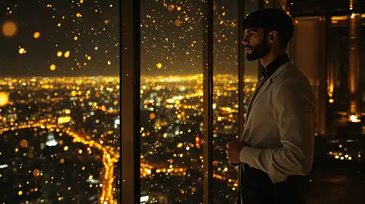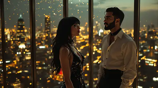 Full body shot Lilith, resplendent in a floor-sweeping, halterneck black designer gown with a daring thigh-high slit, stands poised near the floor-to-ceiling windows, her raven tresses cascading down her back in luscious waves, framing her striking features: straight-cut bangs, deep, enigmatic eyes with smoldering smokey eyeshadow, and full lips painted with dark, crimson lipstick. Her gaze is lost in the breathtaking cityscape, ablaze with twinkling lights, as warm, golden ambient lighting with pronounced bokeh effects wraps around her, casting an intimate, enchanting glow. She wears a pair of leather platform pumps made of Christian Louboutin and A plunging, halterneck black shiny latex designer dress, complete with a high leg split, accentuates her athletic yet feminine physique, while a shiny black collar adorns her neck. She is kissing, Jon, a refined gentleman with a strong, chiseled jawline, warm, gentle smile, and dark, impeccably groomed hair and beard, stands transfixed, his expression a captivating blend of awe, surrender, and quiet reverence. He exudes sophistication in a white expensive tailored dress shirt, the top buttons unbuttoned., his presence illuminated by the soft, golden light. The atmosphere is heavy with mystery, evoking the surreal, dreamlike quality of Tim Burton's Gothic romanticism, H.R. Giger's biomechanical mysticism, and Zdzisław Beksiński's haunting, fantastical landscapes, with a shallow depth of field, dramatic lighting, and an otherworldly ambiance that transports the viewer to a realm of wonder and magic. Shoot with a 35mm Kodak Ektar, --seed1--ar 16:9
