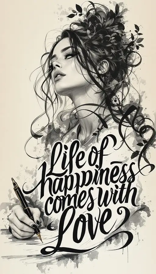 5 months ago Calligraphic Typography, Expressive Letters, Bold Text, Powerful, blone Woman Holding a Pen Writing, Determined Pose, life of happiness comes with love in Literary Portrait Style, Dynamic Composition, Intricate Detail and Calligraphic Rendering, Featured in Typographica, 8k Fine Art Calligraphic Typography, Graphic Design Conceptual Art, Strong Light and Dark Strokes, Direct Light and Calligraphic Shadows, Award Winning Calligraphy, Masterpiece, Ink on Paper, Brody Neuenschwander, Gemma O’Brien, Marian Bantjes, Jessica Hische, El Lissitzky. 23ca71c00ee 0 26