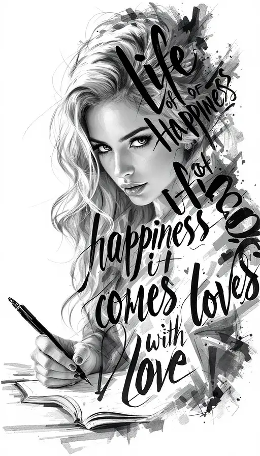 5 months ago Calligraphic Typography, Expressive Letters, Bold Text, Powerful, blone Woman Holding a Pen Writing, Determined Pose, life of happiness comes with love in Literary Portrait Style, Dynamic Composition, Intricate Detail and Calligraphic Rendering, Featured in Typographica, 8k Fine Art Calligraphic Typography, Graphic Design Conceptual Art, Strong Light and Dark Strokes, Direct Light and Calligraphic Shadows, Award Winning Calligraphy, Masterpiece, Ink on Paper, Brody Neuenschwander, Gemma O’Brien, Marian Bantjes, Jessica Hische, El Lissitzky. png, transparent background 23ca71c00ee 0 29