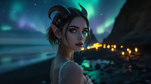 close-up portrait of a female red demon, bathed in a warm, golden glow reminiscent of a sunset over a mystical realm. Her physique, honed from the fires of the underworld, is clad in a sleek, high-cut latex swimsuit with a snakeskin pattern that shimmers like polished obsidian, accentuating her athletic curves. Black latex boots rise up her legs like dark, glossy spires, while her raven tresses cascade down her back like a waterfall of night, styled with sharp, choppy bangs that frame her heart-shaped face like a dark, gothic halo. Large, curved horns protrude from her forehead, casting a faint, otherworldly glow. she smiles seductively to thew camera, and with Beckoning gesture to come to her with passion and desire smile on lips. Ambient blue and red lighting effects dance across the metal accents, casting a mesmerizing glow that evokes the fusion of ancient mythology and modern technology. The air is charged with an aura of anticipation, as if the very fabric of reality is about to be torn asunder by the demon's haunting melody. Melting lava flows across the floor like a river of liquid fire, casting flickering shadows on the walls as the demon's song builds to a crescendo. Inspired by the dark mysticism of Zdzisław Beksiński, the biomechanical nightmares of H.R. Giger, and the stark, gothic elegance of Ashley Wood, with a dash of Syd Mead's 8K hyper-realistic 3D rendering, Roger Dean's atmospheric lighting, and Ash Thorp's cinematic composition, all distilled through the warm, golden tones of a Kodak Ektar lens, complete with subtle lens flare and a hint of film grain.