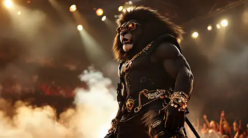 4 months ago A humanoid black lion with fierce golden eyes, standing confidently on a concert stage under dramatic spotlight. The lion has a powerful, muscular build and is dressed like a modern rap artist — wearing a stylish bullet proof vest his huge biceps on show ripped jeans, and oversized sunglasses. He’s covered in diamond chains, rings, and flashy bling that sparkle under the lights. He holds a mic in one paw, mid-performance, with a wild crowd in the background and smoke effects rising from the stage floor. The scene is vibrant, loud, and cinematic — capturing the energy of a live hip-hop concert. Style: Ultra-realistic, cinematic lighting, sharp focus, 8K resolution, urban concert setting, high detail on fur texture, jewelry sparkle, stage lights, and dynamic crowd motion. tmorgan PRO 1 31