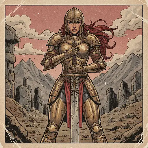 6 days ago Comic book realistic illustration, full body shot of a adult gorgeous warrior woman with thick aesthetic physique, holding a long greatsword. The woman is wearing a full plate armor with helmet. Her hair is blood-red and her skin is tan, with freckles on her face. hand draw, in the form of an old drawing. film effects --ar 4:5 --sref 3171008199 --profile ort49sp --stylize 1000 --niji 6 gks 0 16