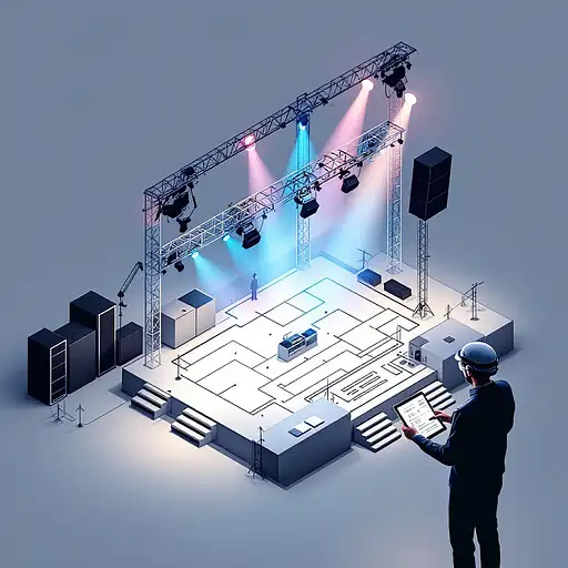 5 months ago Un plan technique de scène en 3D, avec structures alu (truss), projecteurs, et points d’accroche bien détaillés (style isométrique ou vue perspective propre). Un personnage stylisé (genre silhouetté ou minimaliste) avec un casque et une tablette ou laptop, en train de vérifier la config technique, pour refléter la partie formateur/consultant. En fond : des éléments qui évoquent la simulation 3D réaliste (style visualisation lumière/rendu réaliste), pour rappeler la prévisualisation sans la nommer. Des touches subtiles qui suggèrent le calcul de charge ou la sécurité (par ex. des icônes de poids, des chaînes, des crochets bien visibles). LoloVector 0 17