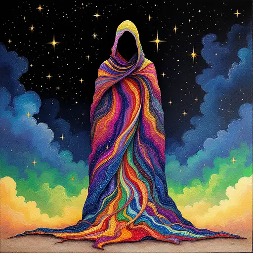 24 days ago A cloaked figure with a long, flowing cloak stands against a starry sky background. Swirling patterns of color in the robe and stars around it symbolize a cosmic connection or spiritual illumination. This artwork is a mixed media painting with vibrant colors and intricate details.in the style of Crocheted --v 5.2 fa14dd77182 1 16