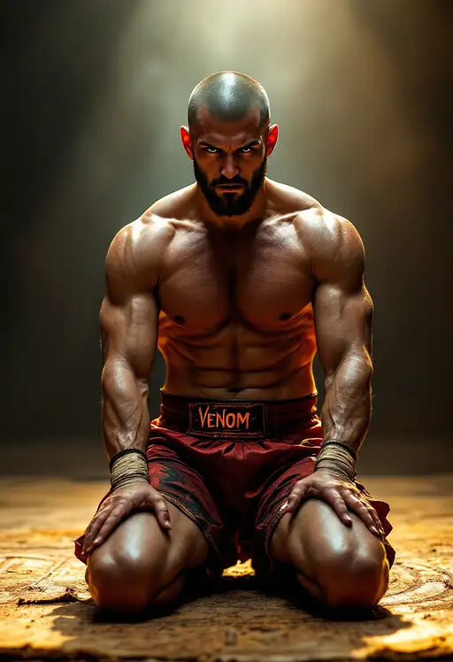 6 months ago A cinematic, highly detailed, and realistic full-body photograph of a 34-year-old European man with a shaved head, kneeling on a traditional muay thai mat, wearing a pair of worn and weathered muay thai red shorts"Venom", a mouthguard, and hand wraps, with a determined expression on his focused face, his skin glistening with subtle sweat, illuminated by soft, warm, and golden lighting that accents the definition of his muscles, with a blurred background that fades into darkness, evoking a sense of intensity and concentration, with the camera positioned low, looking up at the subject, emphasizing his powerful physique and conveying a sense of strength and martial arts prowless.--ar 2:3 --stylize 750 --v 7 Sxylla 1 36