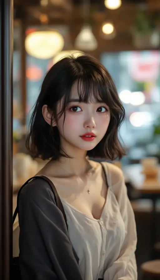 4 days ago a Japanese woman with pure innocent gaze, pale face, little sad, expressive style, smudges, in cafe. One shoulder strap fell off. Standing Kai_Wave PRO 0 12