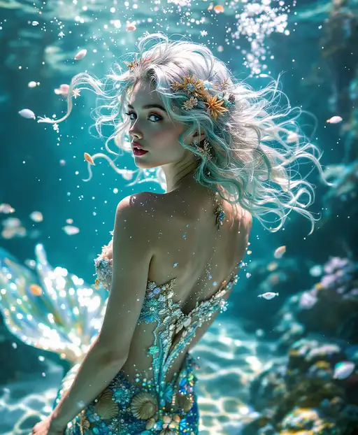 A resplendent underwater realm where imagination and reality entwine, bathed in a kaleidoscope of iridescent colors and ethereal light. The mermaid's flowing, crystalline locks shimmer with stardust-like sparkle, as seashell-adorned embellishments adorn her luscious, flowing tresses. Her shimmering tail, an intricate tapestry of sun-ray patterns, mimics the gentle dance of ocean waves, while delicate details evoke the whimsy of underwater magic. The water, with a soft, luminescent sheen, heightens the mystical ambiance, casting an enchanting glow that beckons the viewer to enter this fantastical world, perfect alluring body figure.