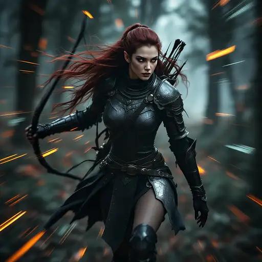 5 months ago an award winning headshot portrait photography, master piece, high quality photography of an epic cinematic shot of dynamic motion" a beautiful 20 year old dark elven woman with long burgundy hair, green eyes, walking, with black armour showing her thighs and carrying a composite bow and wolves in the background", dramatic lighting, Technicolor, in motion, main subject of high budget action movie, raw photo, best quality, high resolution. IanG75 0 32