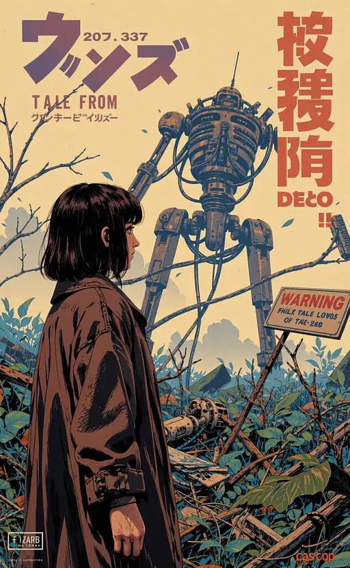 4 months ago Japanese Manga style Poster with bold large fonts and graphics. Oil painting. A woman with short, dark hair and blunt bangs stands in side profile, gazing toward a misty, overgrown field. Behind her, the skeletal remains of a rusted, towering robot lie partially buried in the earth, cables coiling like dead vines. A broken warning sign tilts nearby, its text faded by time. The colors are muted, with a pale amber sky and cold blue shadowsâÂÂan atmosphere of melancholy and mystery. The womanâÂÂs silhouette is softly lit, her coat slightly flapping in the wind. 2:3 ratio, retro-futuristic, eerie and quiet, inspired by Tales from the Loop. <lora:skin texture style v5:1> <lora:RetroAnimeFluxV1:1> <lora:FluxMythP0rtr4itStyle:1>âââ The_Promptonaut 0 33