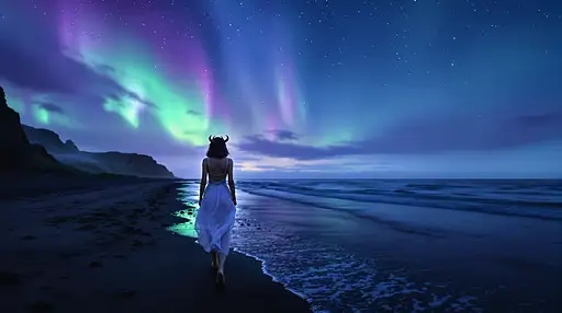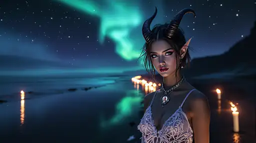 18 days ago Distant view, wide angle photo, waist up, of A female Cambion walking. ( age: early 20, deep blue eyes) humanlike ears helix'. Her toned, athletic physique while her short brown hair runs down to her shoulders, frames her beautiful oblong face. small, horns protrude from her forehead. Her eyes sparkle with creative joy and compassion. Soft gothic makeup with a touch of purple/burgundy tones . her shiny skin reflects the light like sparkling diamonds. she is clad in a slim dress, no shoes, (Dress fabric: sheer white with intricate details) accentuating her curves. simple gothic jewelry and a closed photo locket in a sliver chain around her neck ). She walks towards the lens on a starlight black beach of Reynisfjara, Iceland, at night watching the mirrored calm seas. Aurora borealis lights up the sky a path of lit torches lights her up. Composition. Beach on left side of frame, ocean on the right side Lastdance PRO 0 13
