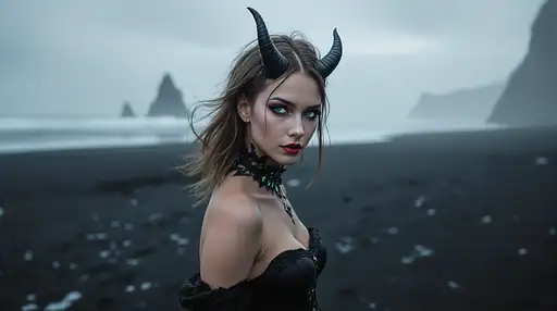 18 days ago Distant view, wide angle photo of A female Cambion (more human than demon look, age: early 20, deep blue eyes) humanlike ears. Her toned, athletic physique while her short brown hair runs down to her shoulders, frames her beautiful oblong face. small, curved black horns protrude from her forehead and normal human ears. Her eyes sparkle with creative joy and compassion. Soft gothic makeup with a touch of purple/burgundy tones (Wednesday Addams) . her shiny skin reflects the light like sparkling diamonds. she is clad in a slim black gothic corset dress - accentuating her curves. gothic jewelry. She walks on the foggy black beach of Reynisfjara, Iceland watching the Heavy seas break against the black beach, moist air forms clouds. Lastdance PRO 0 18