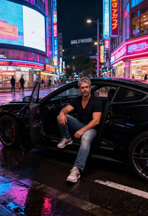 A man with an ideal, well-proportioned body is sitting casually in an all black Ford Mustang GT 5.0 parked on the side of a street in Hollywood at night. His hair is cut short, with the front slightly messy, giving an effortless yet stylish impression. He wears a casual low neck black t-shirt and faded jeans, clean sneakers. The car's front door is wide open. One of his legs is still inside the car, while the other rests on the wet asphalt, creating a laid-back yet stylish pose. His hand rests casually on his knee, and his face is slightly turned toward the camera, with a calm and confident expression staring as if he's in a movie. The background captures the iconic night atmosphere of Tokyo: colorful neon lights. large digital billboards, shops with bright neon signs, and wet streets reflecting the lights after rain. A few pedestrians walk in the distance, adding an urban vibe while keeping the focus on the main subject. Aspect ratio: 9:16”