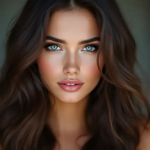 a close up of A captivating woman with long, wavy dark brown hair and striking light blue-gray almond-shaped eyes, exuding elegance and romance. She has an oval face, full lips painted in soft rose pink, arched eyebrows, and smooth fair skin that glows warmly.
