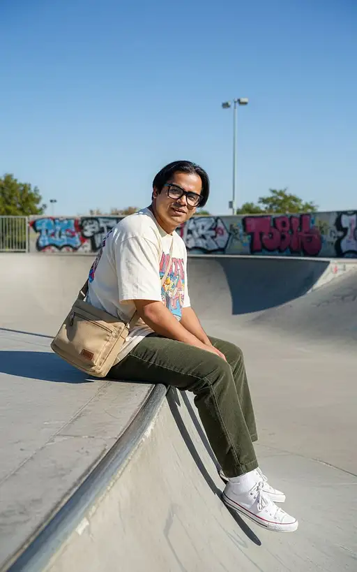 5 hours ago A late-20s man. Clothing: Loose cream-colored graphic t-shirt, dark olive green corduroy trousers. Footwear: Classic canvas low-top shoes with white laces. Accessories: Canvas crossbody bag, thick black frame glasses. Pose: Sitting on a skate ramp edge, looking over his shoulder. Camera Setup: Fujifilm GFX 100S, 50mm lens, f/4.0, flash fill. Angle of Capture: Medium shot, slightly low angle. Setting: Sun-drenched concrete skate park. Lighting/Mood/Time of Day: Bright, high-key daylight, playful mood. Style and Finish: Lifestyle photography, sharp focus, vibrant color grading. Negative Prompt 2: Deformed hands, facial blemishes, blurry edges, poor composition, artifacts, out of focus, duplicate elements, low quality, noise, weird textures, double image bads 0 1