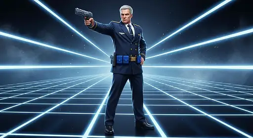 A jaw dropping stylish mesmerizing hyper realistic visually stunning super captivating breathtaking masterpiece depicting a commanding officer standing tall with a powerful stance radiating authority & controlled menace. His sharply tailored navy suit fits with flawless precision accentuating an exaggerated heroic physique that combines elegance & brute strength. His shoulders are broad his chest powerfully defined beneath the fabric & every crease of the uniform adds depth realism & editorial polish. His silver hair gleams under pristine lighting as a fierce expression cuts through the stoic calm of his face. In one hand he grips a futuristic sidearm aimed slightly downward with deliberate control while his other rests confidently by his side exuding dominance & tactical precision. The background glows with sleek grid lines stretching into infinite perspective adding cinematic futurism. The tilt shift effect gives a stunning 3D feel with multiple focus planes creating intense realism as his weapon and belt stay in razor focus while the grid fades into dreamy blur enhancing spatial depth. His blue tactical belt & gear pop with vivid contrast against the uniform’s darker tone producing perfect color balance & clarity. Every metallic buckle reflects crisp light adding lifelike gleam & texture. His eyes reveal unshakable discipline while subtle shadows sculpt his facial features into timeless authority. The atmosphere is charged with unspoken tension as faint vapor trails & lens reflections float across the frame giving a layered multidimensional field of depth. His polished boots ground the image in realism while the perspective lines pull the gaze upward amplifying grandeur & scale. Each detail feels choreographed to perfection from the texture of fabric threads to the metallic gleam of his weapon. Hyperstylized cinematic lighting wraps him in an aura of dominance & command. The entire scene radiates power legacy & mastery a visual symphony of form control & depth rendered with immaculate clarity & artistic perfection that captures the spirit of unbreakable leadership in its purest most cinematic form.