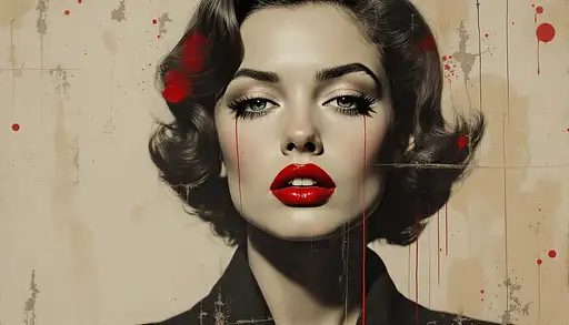 Gottfried Helnwein + Shepard Fairey + urban poster decay, where Helnwein's hyperrealist precision creates photographic sharpness through crisp detail and strategic desaturation to earth tones, Fairey's street art methodology produces layered weathering via controlled drip marks and surface distress over intact imagery, and urban poster decay infuses raw environmental erosion. The fusion manifests as high-resolution photographic clarity overlaid with aged paper texture, muted sepia-grey palettes interrupted by vivid crimson accents, and grunge surface treatments—drips, stains, tears—that weather the material without softening detail, transforming any subject through sharp contemporary rendering bearing historical patina. 1950s woman, bold direct eye contact and expression, standing, full body