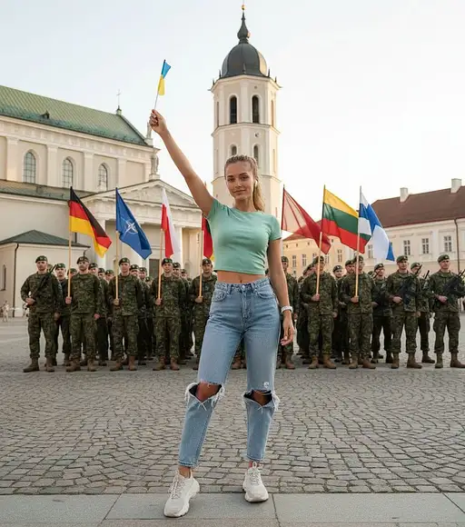 A captivating pin-up girl reminiscent of the 1940s, her curvy, full-figured, statuesque, voluptuous, figure accentuated by a striking corset lingerie ensemble. The garment is a vibrant display of patriotic hues, featuring bold reds, crisp whites, and deep blues intricately woven throughout the design. Delicate lace trims and perhaps satin ribbons further enhance the allure. Adorning her body are pieces of vintage-inspired jewellery, possibly delicate chains or bracelets featuring charming star and stripe motifs that subtly echo the theme of her attire. She strikes a confident pose against the backdrop of a bustling military airbase from the same era. Majestic vintage aircraft, perhaps propeller planes with their iconic silhouettes, stand proudly in the background, their metallic surfaces gleaming under the sunlight. Mechanics in period-appropriate uniforms might be seen working diligently nearby, adding to the authentic atmosphere. The scene could be set on a slightly windswept tarmac, with perhaps a glimpse of hangars or other military buildings in the distance. The overall lighting suggests a bright, sunny day, casting soft shadows and highlighting the vibrant colors of the pin-up girl's outfit and the impressive machinery surrounding her. The air might feel charged with a sense of wartime energy and patriotic fervor, perfectly complementing the subject's captivating presence.