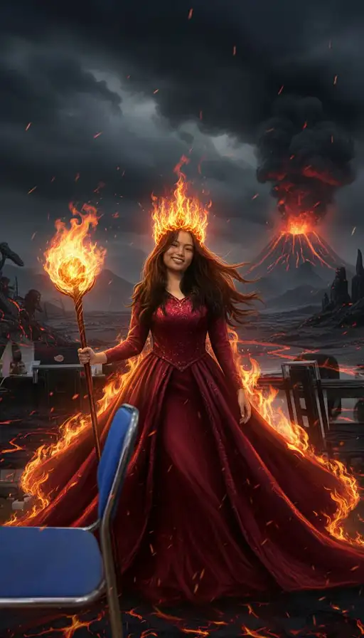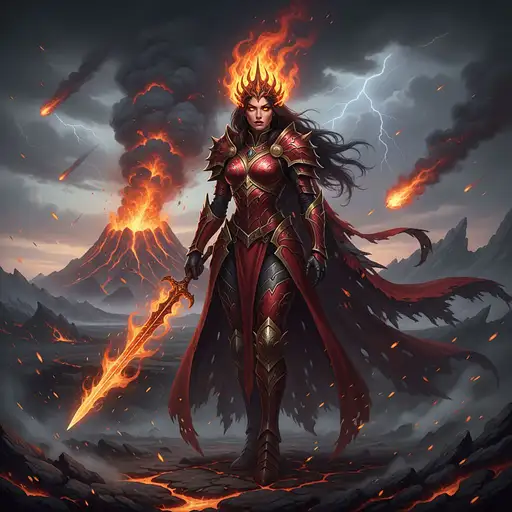 5 months ago Create a photorealistic image of an African American woman embodying the "Queen of Fire" character. Her slick, straight grey hair flows dramatically as she stands confidently inside a volcanic setting, surrounded by glowing lava and ash. She wears a burning red robe that billows around her, a crown made of flames perched atop her head, and a bra crafted from shimmering gold. The loincloth appears to be made of fire, flickering and alive. Use high contrast, dramatic lighting to enhance the scene, with cold shadows and a cinematic color palette featuring deep reds, oranges, and dark blacks. Capture the intense atmosphere with luminescent particles floating in the air, emphasizing her powerful presence. Aim for high resolution and exceptional detail, creating an epic visual impact. Selfishreasons 1 29