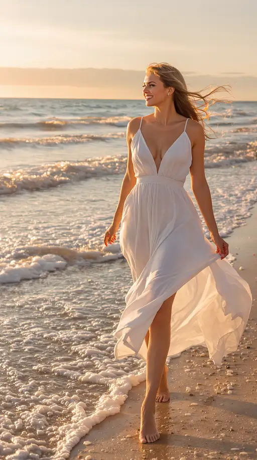 worms eye view looking up at a woman as She stands on a narrow dirt path lined with tall golden grasses, looking slightly downwards with a soft, warm smile. There is an extremely low angle from below the level of her ankle that creates a very, very sharp upward perspective. She wears a short, flowing summer dress in soft earth tones, perhaps light beige, warm peach, or faded terracotta, that moves gently with the evening breeze. Her bare arms and legs catch the low sunlight, giving her skin a radiant glow. She is moving a strand of hair away from her face. The golden hour light bathes the entire scene in warm amber tones. Behind her, a serene lake reflects the soft orange and pink hues of the sky. A lone tree with vibrant autumn foliage frames the composition on one side, while majestic mountains fade into the distance, their silhouettes layered in hazy blue and gold. A few clouds drift in the sky, adding depth and softness to the scene. she is looking coquettish and demure, with her arms out while doing a twirl. Captured in 8K resolution with cinematic composition, shallow depth of field centered on the model, and rich color grading to enhance the contrast between warm light and natural textures. The atmosphere is poetic, nostalgic, and serene, perfectly blending fashion and the quiet beauty of nature. Worms eye view looking up at subject. There is an extremely low angle from below the level of her ankle that creates a very, very sharp upward perspective.
