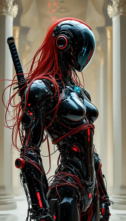 In the style of ck-sfc, envision a female cyberpunk robot samurai with a mesmerizing robot face concealed behind a mirrored face shield that reflects the surroundings like polished silver, accentuating an air of mystery and technological advancement. The hyperdetailed helmet is adorned with intricate mechanical patterns and neon accents that glow softly, casting an ethereal light on the surrounding metallic body parts. Flowing black hair cascades down her back, a stark contrast to the cold, metallic complexion of her robot physique, with strands occasionally intertwining with cables and wires that protrude from her arms and torso, symbolizing a blend of organic elegance and synthetic resilience. Her reflective black and neon red armor glistens under the soft glow of the abstract background, which hints at the serene yet mystical ambiance of an eastern temple, with blurred outlines of cherry blossoms or traditional lanterns faintly visible through a veil of mist or smoke, imbuing the scene with a sense of ancient tradition meeting futuristic innovation. As she stands poised, ready for action, her robot joints are slightly flexed, suggesting the dynamics of movement, as if she might draw her katana - strapped elegantly to her back with a blend of leather and metallic straps - at any moment, releasing a flurry of steel and neon light into the tranquil atmosphere. The depth of the frame is enhanced by the subtle blur of the background elements compared to the sharp, hyperdetailed focus on the robot samurai herself, creating a sense of dimensionality that pulls the viewer into the world of the image. An emotional component of determination and honor emanates from her stance and the glow of her neon accents, as if the very fusion of human spirit and machine has created a being of unyielding principle and beauty. The scene is shot with a lens effect that adds a slight vignette, focusing all attention on the cyberpunk samurai, while a fashionable atmosphere permeates the image, blending traditional Japanese motifs with cutting-edge cyberpunk elements in a mesmerizing dance of light, metal, and myth, complete with accents of neon that melt into the shadows, creating an aura of futurism tinged with the timeless essence of the samurai code.