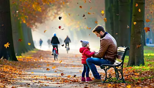 15 hours ago A young father in a brown jacket and blue jeans sits on a bench in an autumnal park with his little daughter, who is wearing a red coat, playing music with her. Picturesque realism. Colorful leaves fall from the trees and are blown by the wind across the park path, where a few people ride by on bicycles. Fog drifts through the scene on a late autumn or winter evening. The atmosphere is calm, contemplative, and emotionally moving. Rich texture, balanced proportions, soft lighting, muted color palette. hb6e22d44c224 0 3