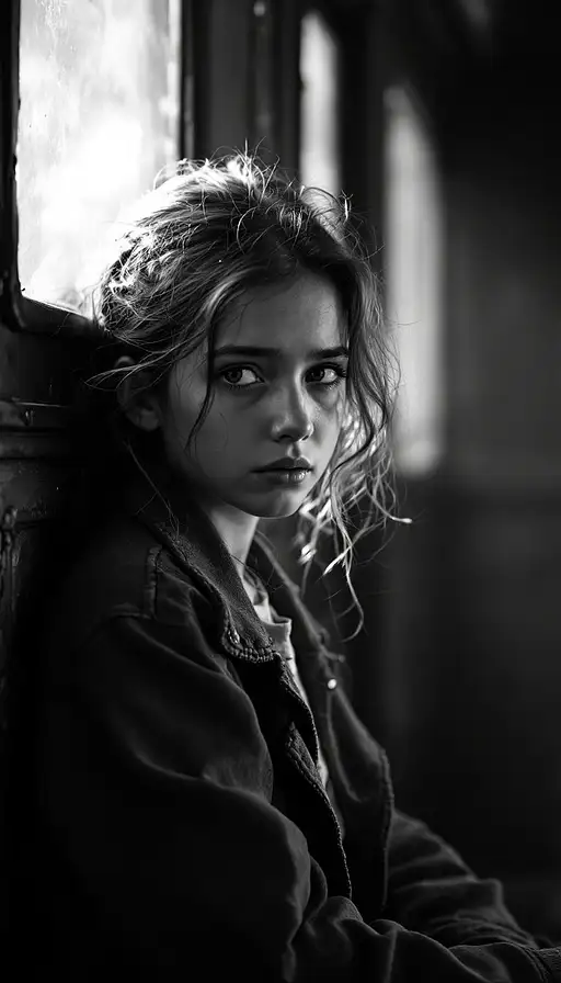 This is a captivating, dreamlike portrait of a young Asian woman, bathed in a warm, ethereal light. Lighting: The lighting is the most striking feature of this image. It's dominated by a strong, warm backlight, likely from the sun during golden hour or a powerful artificial source mimicking it. This backlight: Creates a brilliant, almost blown-out halo effect around her dark hair and the edge of her right shoulder, making them luminous. Produces significant lens flare, visible as bright streaks and soft, circular bokeh orbs, some of which exhibit prismatic rainbow refractions, particularly noticeable around the flowers and her hair. This flare adds to the dreamy, almost magical quality of the shot. Casts her face in relative shadow, yet it's still softly illuminated, likely by diffused ambient light or a subtle fill light from the front/side. This creates a beautiful contrast, highlighting her features without harshness. The overall quality of light is soft and diffused, despite the strong backlight, contributing to the gentle, ethereal mood. The warmth of the light (golden yellows and oranges) dominates the highlights. Model's Expression: The model's expression is direct, intimate, and somewhat enigmatic. She gazes directly at the viewer with dark, expressive eyes that reflect the light. Her lips are softly parted, not quite forming a smile but conveying a sense of openness or perhaps a quiet, unspoken thought. There's a hint of vulnerability and pensiveness in her expression. It's not overtly sad, but rather introspective and perhaps a touch melancholic or wistful. The slight tilt of her head and the way her dark, tousled hair (with bangs) frames her face add to the intimacy and softness of her look. Other Details: Features & Appearance: She has delicate facial features, with smooth skin that catches the light subtly. Her dark, shoulder-length hair is slightly messy, contributing to the natural, unposed feel. Her makeup, if any, is very light and natural-looking. Attire: She's wearing a light-colored (likely cream or off-white) textured knit sweater, which also catches the backlight beautifully along its fuzzy edges. Props: She's holding a bouquet of white daisies with yellow centers. These flowers are in the foreground, some in sharper focus, others softly blurred, and they interact with the lens flare, adding to the visual interest and depth. Composition: It's a close-up shot, focusing on her face and upper body. The depth of field is shallow, keeping her face relatively sharp while the background and parts of the foreground are softly blurred. Atmosphere: The overall mood is dreamy, ethereal, intimate, and slightly nostalgic. The combination of soft focus, warm backlighting, lens flare, and her pensive expression creates this feeling. Technical: The image has a soft, slightly grainy texture, reminiscent of film photography, which enhances its artistic and vintage feel. In essence, it's a beautifully lit portrait that uses light and the model's subtle expression to evoke a powerful sense of intimacy and dreamlike beauty.