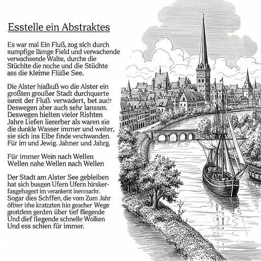 4 months ago Erstelle ein abstraktes Bild, basiert auf dem Text: Es war mal ein Fluß. Der zog sich durch sumpfige niedrige Felde und verwachsende Walde, durch die kleine Dorfe und die Städte die noch kleiner waren als die kleine Dorfe. Die Alster hieß der Fluß. An der Stelle wo die Alster ein großer Stadt durchquerte hat sich der Fluß verändert, ist breit und tief geworden, aber auch sehr langsam. Deswegen hielten viele Reisende die Alster für einen See. Die Jahre liefen vorbei als waren sie von die dunkle Wasser mitgenommen, immer weiter und weiter. Bis sie sich ins Elbe fanden und dort verschwanden. Für immer und ewig. Jahre für Jahre. Wellen nach Wellen. Der Stadt am Alster See war aber geblieben, hat sich am buschigen Küsten Ufern festgehalten, verankert im nasse Erde mit immer mehr Häuser, Strassen. Sogar die Schiffe, die vom Jahr zum Jahr öfter hierher ihre Wege gefunden haben, kratzten mit geraden Masten über die tief fliegende schnelle Wolken. Und die Wolken blieben über die Stadt hängen - es schien für immer. 7834732f7ce 0 66