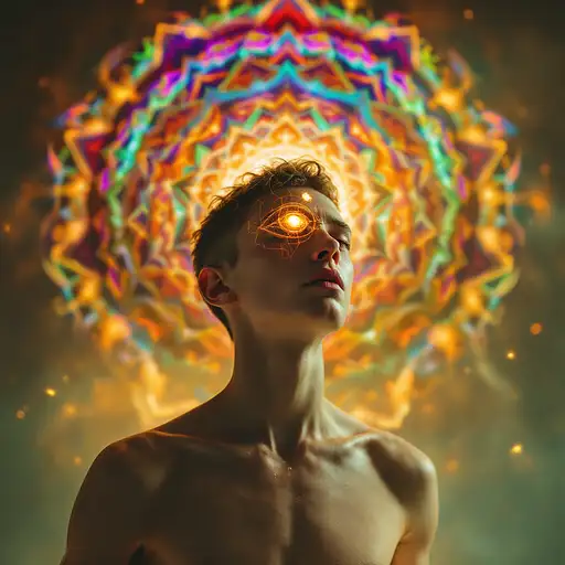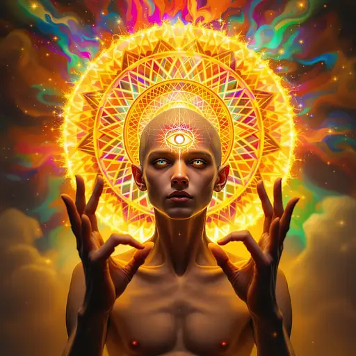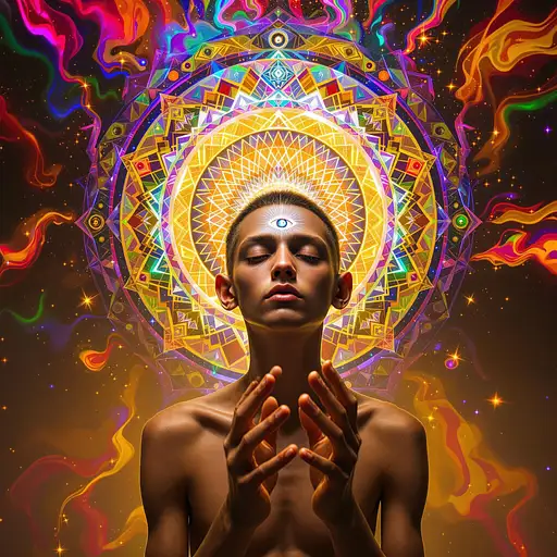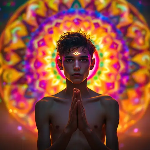 7 months ago Hyper realistic eye level exterior photo A surreal portrait of a very skinny young guy with a huge multi-colored mandala behind his head, set against a warm golden light and vibrant, swirling colors. the camera pulls up and out and we see the young guy performing occult hand signs, as the mandala shimmers and the third eye in the boy's forehead blinks spacetool 0 20