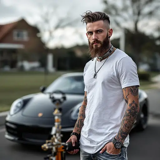 2 months ago Charismatic skinny Gothic Guy in good shape with Tattoos wearing a white t and Jeans. Standing next to a black porsche. CaptChaNet 0 26