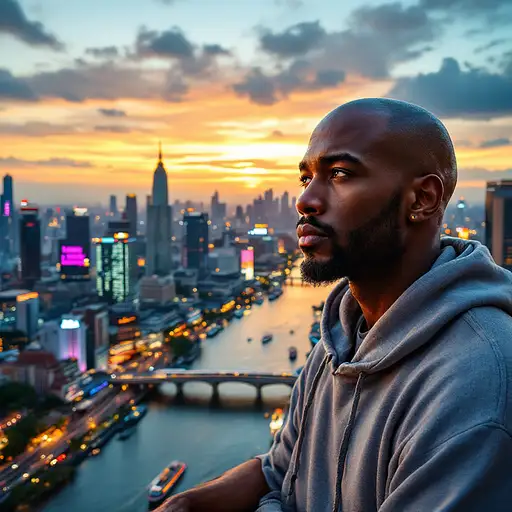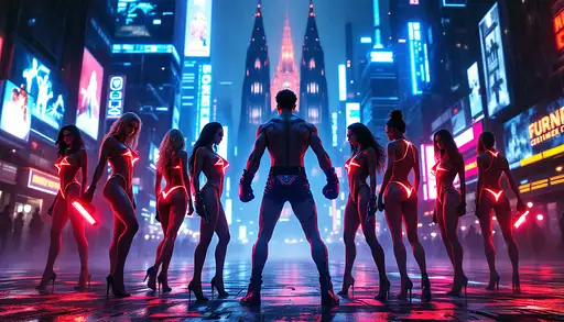 **Behind her, the legendary alt-rock band Hoobastank stands, now fully adapted to the dystopian cyberpunk world.** Doug Robb, the lead singer, wears a **black armored vest covered in neon circuit-like etchings, his short, dark hair spiked and illuminated by the holographic displays surrounding the stage.** His microphone pulses with a deep, electronic hum as he steps forward, his voice resonating through the megacity’s underground frequency—**hacked and hijacked from corporate airwaves.**