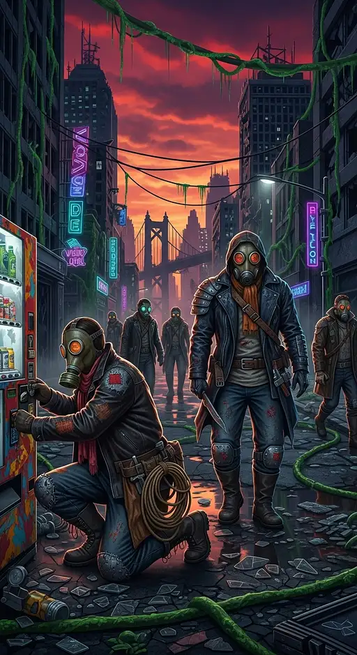 The band’s **bassist and guitarist wield custom cybernetic instruments**—**one with strings made of raw plasma energy, another crafted from repurposed industrial tech, sparking with kinetic charge as they play.** The drummer, positioned behind a **transparent, holographic drum kit,** pounds out a beat that syncs with the **rhythmic flashes of distant riots and neon billboards glitching in the distance.**