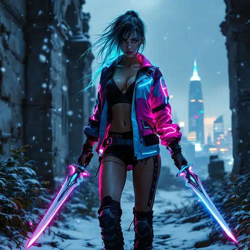 She grips a **modified, high-tech electric guitar—its frame sleek and black, its strings pulsing with vibrant arcs of violet energy, reacting to every motion of her cybernetic fingers.** Her **metal-plated combat boots splash through the rain as she steps forward, her gaze defiant, her leather trench coat flowing like a battle banner.** Her once-glamorous pop star look is long gone—**replaced with armored mesh clothing, studded belts, fingerless gloves that emit holographic controls, and glowing tattoos coded with encrypted resistance messages.**