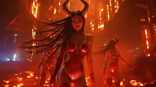 high, angeled down -photoshot of 3 female dancers in red demon outfits, bathed in warm, golden light, reminiscent of Zdzisław Beksiński's dark mysticism and H.R. Giger's biomechanical nightmares, with Ashley Wood's stark, gothic elegance. Her toned, athletic physique is clad in a sleek, Rawish Shiny Black fishnet pattern latex revealing swimsuits (high hipcuts )accentuating her curves, , latex boots, while her long, black hair cascades down her back like a waterfall of night, styled with sharp, choppy bangs framing her heart-shaped face. Large, curved horns protrude from her forehead, as they dance amidst an electric atmosphere. Ambient blue and red lighting effects dance across the metal accents, casting a mesmerizing glow, evoking the mystical fusion of mythology. melting lava on the floor, Inspired by Syd Mead's hyper-realistic 3D rendering, Roger Dean's atmospheric lighting, and Ash Thorp's cinematic composition, with a Kodak Ektar lens-inspired aesthetic, featuring subtle lens flare and warm, golden tones.